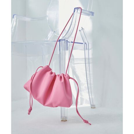 今シーズントレンドの、横長の巾着バッグ。ボリュームのあるギャザーで、絞った際のフォルムが特徴。内側に付いたショルダー紐は好きな長さに調節可能。