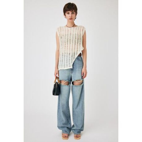 【TAPE YARN KNIT TANK】テープヤーン糸が目を引くニットタンク。深く入ったスリットがポイントになっているので、肌見せしてヘルシーに仕上げるのがおすすめです。1枚で存在感のあるアイテムはこの時期活躍すること間違いなし。■透け感:あり■光沢感:なし■伸縮性:あり■裏地:なし