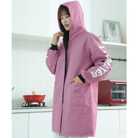 英字Logoがお洒落、コートのように着るファスナー付きの前開き割烹着風エプロン