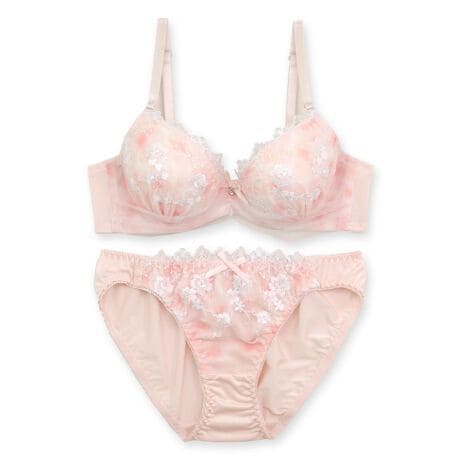 フラワー刺繍が高級感のあるパッド内蔵の盛り胸タイプのブラとショーツのSET。