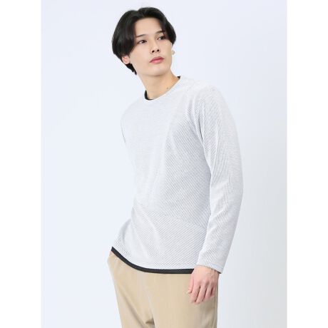 ふくれストライプ フェイククルーネック長袖Tシャツ