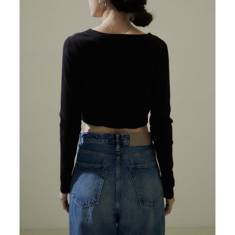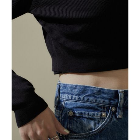クロップド丈+ハイウエストパンツで合わせた抜け感のある肌見せスタイルがバランスよく◎