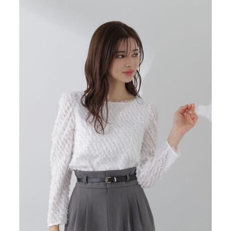 【商品特徴】カットジャガードの毛足感が特徴的な映えブラウス。着るだけでこなれ感が出るので、普段のコーディネートのアクセントにぴったりです。襟ぐりはすっきり見え、後ろはスリット開きとボタン付き。身頃はシンプルなので、ボトムスにINするとキレイに決まります。【スタイリング】パンツを合わせれば、甘すぎない大人フェミニンな着こなしが完成します。
