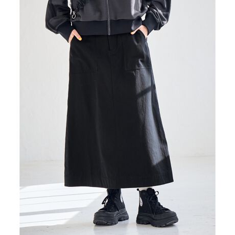 ・大きなパッチポケットがアクセントとなるベイカーパンツ風ロングスカート。
