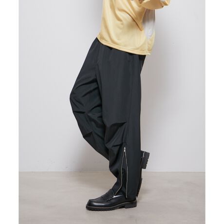 裾のジップはマチ付で全開に開くとワイドストレートにシルエットが変化します。