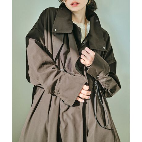 程よくミリタリー要素をミックスさせた、身体をゆったりと包み込んでくれるモッズコート。顔まわりも包み込むような大きなスタンドカラーが、前を開けるとラペルのような見え方になり、カジュアルすぎない表情になるのが魅力。内袖側に付いたドットボタンで袖口を細くできる仕様や、裾のファスナー開閉によってスリットを調節できて抜け感を加えられるデザイン、ウエスト部分のドロスト仕様によるギャザー調整で好みのバランスで女性らしい着こなしを叶えられるなど、こだわりの詰まった一着。