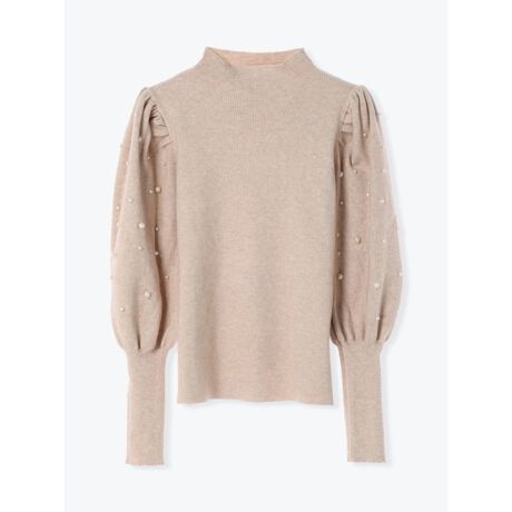 大小のパールビーズを散りばめたマトンスリーブのニットプルオーバー。