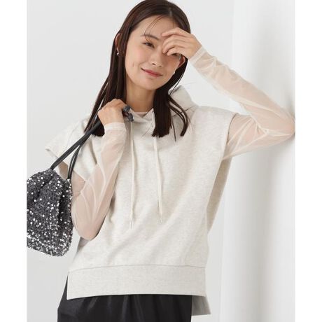カジュアルなフードパーカーは、レイヤードで薄手のトップスを合わせたスタイリングがお勧め。肩のラインを下げたドロップショルダーで、二の腕をほっそり見せてくれます。裾はサイドスリットが入っているので、ボトムスを合わせたスタイリングに抜け感をプラス。落ち感のあるナロースカートを合わせた、ミックスコーディネートがイチオシです。
