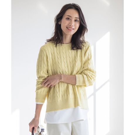 ケーブル柄で編みたてた、クラシックなクルーネックニット。トラディショナルな総柄のケーブルで、1枚で着てもサマになり、シャツやカットソーなどと合わせたレイヤードスタイルもできるような程良いサイズ感に仕上げました。サイドにスリットを入れて、すっきりとしたシルエットで着ぶくれせずに着こなせます。着丈に前後差を出しているため、パンツにもスカートにも合わせやすく、コーディネートに華やかさをプラスするカラーも魅力です。カラーは、春を感じる華やかなイエロー(#040)、上品なベージュ(#033)、爽やかなスカイブルー(#072)、柔らかなピンク(#012)の4色展開です。