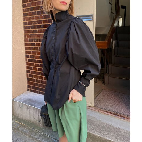 肩周りにたっぷりとタックを施し、モードなパワーショルダーを表現。