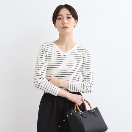 【洗える/無地&ボーダー柄】ランダムリブ Vネックニット