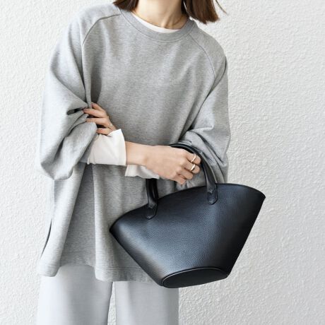 ラウンドカットがポイントのバスケット型バッグ。