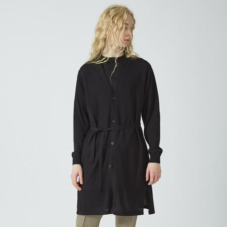 織るだけで上品な雰囲気を醸し出すロングカーディガン。共布のベルトでウエストマークしたりすることもでき、着こなしに応じて雰囲気を変えられます。サイドスリットや切り替えデザインなど随所にブランドらしさを感じられる一着です。