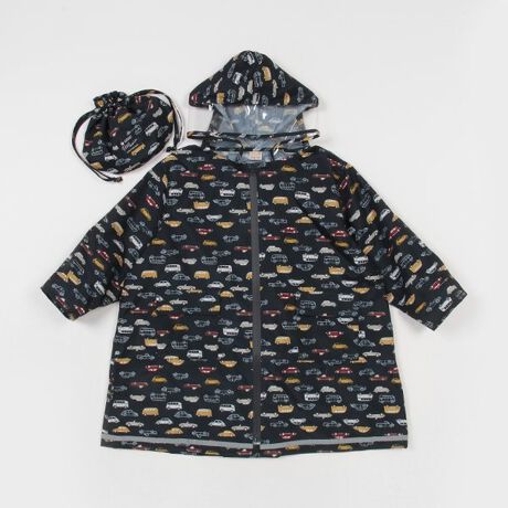 クリアな窓つきのフードで前が見やすく、袖口にはゴムを入れてまくりあがりを防止しました。