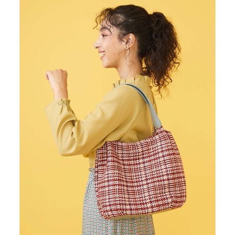 春夏らしい配色のチェックジャカード生地を緩やかなラウンドフォルムで仕上げたトートバッグ。コンパートメントにはオープンポケットとファスナーポケット付きで使いやすく、マチ付きでしっかりとした収納力も嬉しいポイントです。フェイクレザーの持ち手とクラフト感のあるテキスタイルの異素材合わせとホコモモラらしいカラーリングがコーディネートに映えるおすすめのアイテムです。