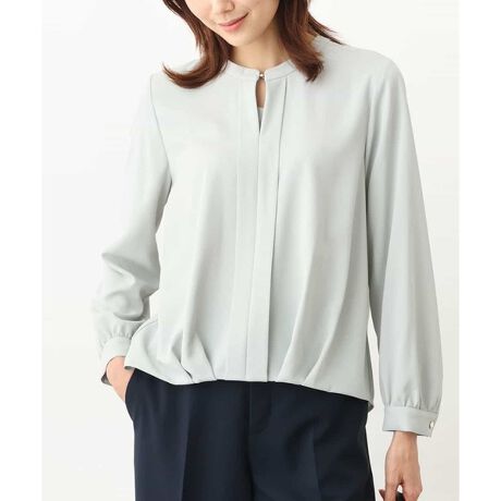 衿ぐりのフロントデザインが華やかさをプラスするきちんと見えブラウス。前後差をつけた着丈とフロントのタックで、前だけタックインしたようなシルエットが着るだけで完成し、ヒップラインをカバーしながらスタイルアップをかなえてくれます。