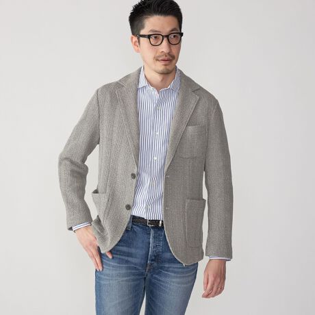 ニットジャケットとカットジャケットの中間的なアイテムを狙った一枚です。