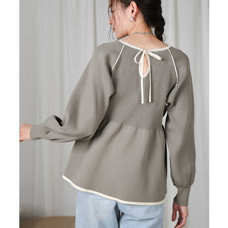 配色のパイピングが目を惹くペプラムトップスが登場しました。スウェットのような風合いの滑らかなニットで、上品な見た目ながら大人カジュアルに仕上げたいときにもピッタリです。適度な厚みで安心感のある着心地と、腰回りまでカバーできる着丈が嬉しいポイント。ウエストの細見えを叶えるペプラムデザインに、アクセントのバックリボンで可愛らしさも忘れない レディな印象を与える1枚です。