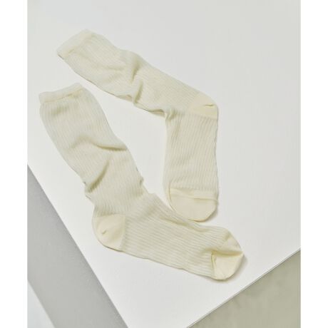 柔らかいコットン糸で繊細に編み上げたガーゼのような仕上がりのソックスです。テンションが強くかかっておらず、筒丈も長めの設計なので、クシュっとたるませても可愛く履いていただけます。とてもシアー感がある繊細な素材なので、春らしく足元に抜け感をプラスしてくれる1品。つま先上部の縫い目を足底に持っていきごろつきがないスムースな仕上げになっているので、サンダルやオープントゥでもソリッドな美しいトゥ先が叶います。