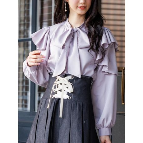 デシン肩フリルボウタイブラウス