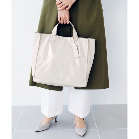 [型番:3142121702]光の入り方で色々な表情を見せてくれるエナメルトートバック。●ポイントマチのあるスクエア型で収納力抜群。ジップで閉じられる箇所あり。雨の日に濡れてしまってもサッと拭けて、汚れも取りやすい。春らしくアイボリーが登場