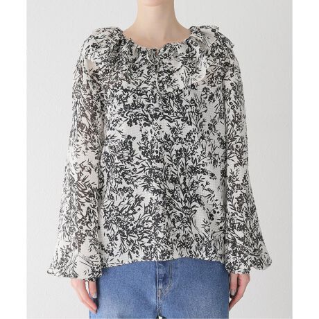襟元のフリルからふんわりとしたシルエットを作るフェミニンなブラウス。