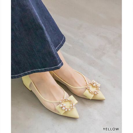 幅広のリボンにキラキラと輝く上品なパールとビジューパーツを施したポインテッドトゥパンプス。