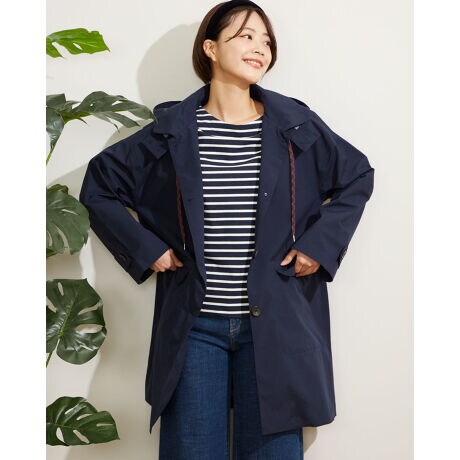 防風性、防水性に優れた素材を使用。身幅の広いミドル丈でゆったり広がるシルエットがかわいいです。着脱可能なフードが付いて、オリジナルで作製した紐がアクセント。幅広いシーンで活躍する1枚です。
