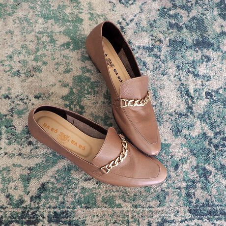 オンにもオフにも使える細身のモカパンプス。チェーン風の華奢なビットでキリっとし過ぎず、エレガントな雰囲気。