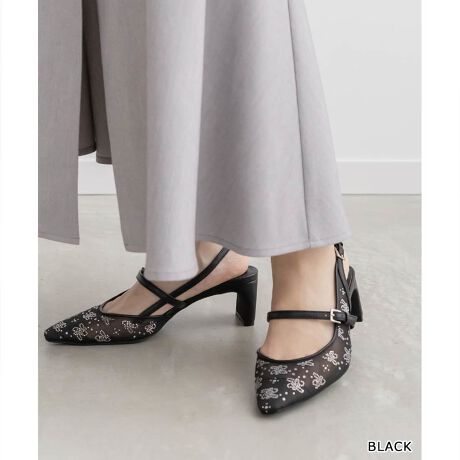 RANDAオリジナルのモノグラムをホットフィックスストーンであしらったシアーパンプス。
