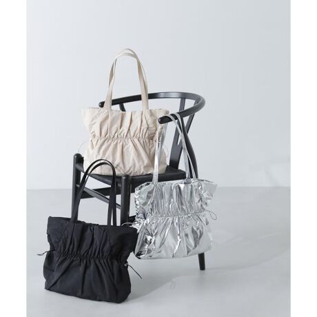 ギャザーをふんだんに入れたデザインと、トレンドのドローストリングディテールが効いた軽量なトートバッグ。本体サイドはペットボトルや折りたたみ傘などが収納できる便利なポケット付き。横にA4ファイルやノールパソコンがすっきり収まるサイズ感で、口元はマグネット付きできちんと閉じる仕様です。NBBのロゴがさり気なく入っているショルダーストラップがポイント。※モデルの着用画像の場合、光の当たり具合により、実際の色味と異なって見えることがございます。色味は、商品単体の画像をご参照ください。