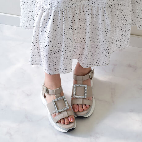 スクエア型のシャープなバックルが大人っぽくカジュアルなスタイルにハマるスポーツサンダル。ヒール部分にはラメ生地を使用し細部にもこだわった1足です。重さを感じさせない履き心地の良さで夏のお出かけにぴったりです。