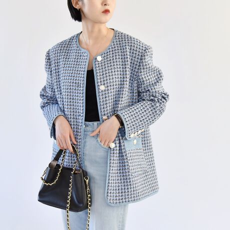 衿周りやポケット、パイピング部分にはデニム生地を使用することで、ツイードとデニム、