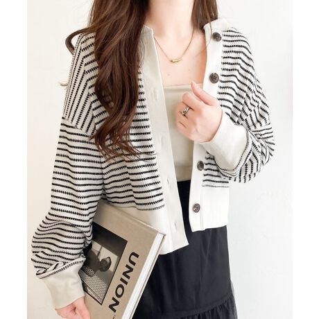 《Javaジャバコラボ》配色ステッチが目を惹く。前後2wayショート丈ジャガードカーディガン