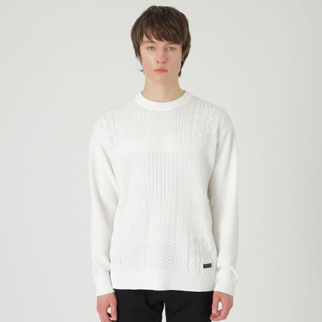 フロントを異なる編み柄で切り替えたパッチワーク調のデザインニット。クレストブリッジチェック柄を基にしたピッチで切り替えた遊び心あるデザインになっています。全て同色で編み上げる事で存在感ありながらも着回しやすいアイテムに仕上がっています。