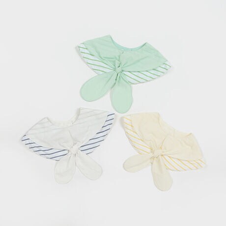 さわやかなマリンコーデが楽しめるスカーフモチーフのスタイです。リボンタイのような垂れた布で顔まわりに華やかなアクセントをプラスします。ストライプ柄も相まって、明るい雰囲気を演出できるのも魅力。首周りはスナップボタンで2段階に調節できます。よだれをしっかりガードする防水仕様。内側にはお名前を記入できるタグつきです。