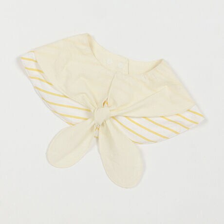 さわやかなマリンコーデが楽しめるスカーフモチーフのスタイです。リボンタイのような垂れた布で顔まわりに華やかなアクセントをプラスします。ストライプ柄も相まって、明るい雰囲気を演出できるのも魅力。首周りはスナップボタンで2段階に調節できます。よだれをしっかりガードする防水仕様。内側にはお名前を記入できるタグつきです。