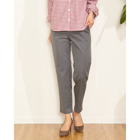 [型番:467JB711]柔らかい素材をつかったテーパードパンツです。すっきり見えるシルエットなのに、ストレッチ性やお腹シャーリング仕様でストレスなく穿いていただけます。