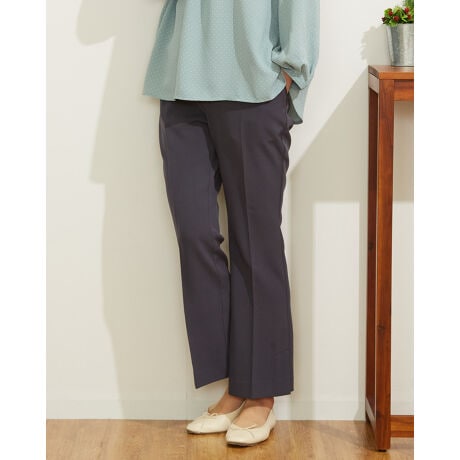 ほどよい厚みと弾力がある2重織りの生地をセレクトしています。表と裏、整った織り目に、ほんのりと艶のある表情が大人っぽい1本。膝の筒幅を絞り、裾にかけて幅を出したセミフレアのシルエットがポイント。裾脇のベンツなどトレンドのエッセンスを込めたディティールが、こなれた雰囲気を演出します。フロントはタックがなくハンサムな見た目ですが、後ろウエストのゴム仕様やダーツ処理など丸いヒップにフィットするようにしています。ボトムのシルエットが変わるといつものトップスも活きて見えるのでフレアパンツ初挑戦の方にもおすすめです。