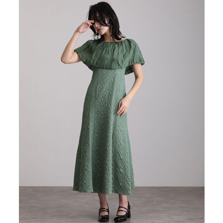 マルチWAYのケープ+ジャガード素材のワンピースのセットドレスケープのリボンはコーデのアクセントにふんわりと女性らしいケープはブラウスの様に着用したり、オフショルやベアトップにしたり等、着こなし方は自由自在です