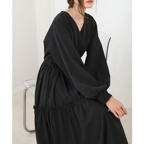 シャカシャカ素材のVネックワンピースです。スカート部分は2段階のティアードになっており、下のティアードはギャザーが見える仕様になっていて、トレンド感を引き出してくれるポイントです。袖口は幅広いシャーリングなので、袖を上げてボリューム袖のシルエットにして着用するのも素敵です。ウエストに付けるリボンは前後どちらでも結べるので、気分やコーディネートの雰囲気に合わせることができます。シャカシャカ素材ですが、仕様やシルエットがカジュアル過ぎないので綺麗めな感じでもコーディネートしていただけます。