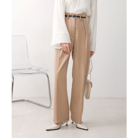 華奢なベルトがセットになったハンサムなタックパンツが登場です。脚長効果のあるハイウエストで、センタープレスが全体をスッキリと見せてくれます。ウエストの両サイドは段差のあるデザインでよりくびれを強調するアクセントに。きちんと感がありながらも脚のシルエットを拾わないので、オケージョンシーンにはもちろん お仕事やお出かけにも気軽にお召し頂けます。