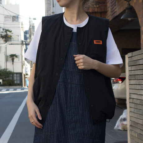 パッカブル可能で持ち運びやすいナイロン100%のベスト。シティユースしやすいカラーにブランドアイコンのオレンジネームがポイント。