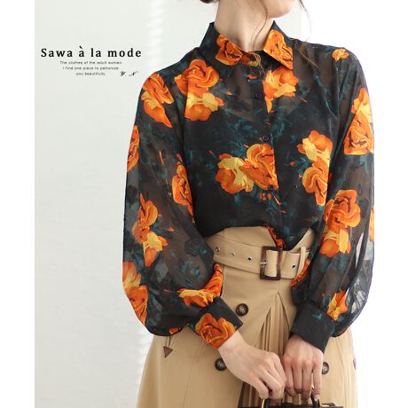 艶やかなオレンジの花咲くふんわり袖シアーブラウス。黒い薔薇の模様にオレンジの大きな薔薇のプリントを重ねた華やかなデザイン。透け感のあるシアー生地は素肌を美しく魅せてくれます。ふんわりボリュームのあるパフスリーブが大人可愛い印象にしてくれます。シンプルなボトムスもパッと華やかにしてくれる1枚です。