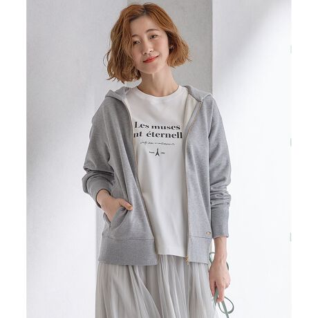 上品な印象の、大人のジップアップフーディーです。肩のラインを前はドロップ、後ろはラグランでなじみの良いシルエットに仕上げました。ポケットはスリット仕様で主張しすぎないので、軽く羽織るアイテムとしても合わせやすく、ウエスト周りもすっきりと見えます。ベーシックなアイテムですが、ファスナーやメタルパーツは全色ゴールドでクラシカルなイメージに。ロゴ刻印の入ったパーツで、ベーシックアイテムであるフーディーを大人っぽくアップグレードしています。まだ肌寒いけど春らしいスタイリングを楽しみたい、そんな時にはトレンチコートやジャケットからフードを出してスタイリングしていただくのもおすすめです。長くレイヤードが楽しめる、季節の変わり目に頼れるアイテムです。カラーは、ベーシックなライトグレー(#003)、クリアなホワイト(#001)、なじみの良いベージュ(#033)の3色展開です。
