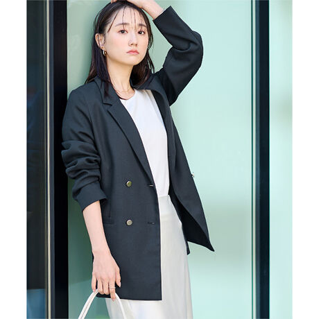 テーラードカラーで綺麗見えするダブルブレストジャケット。