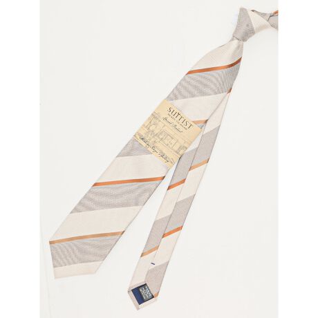 Vゾーンを華やかに彩るストライプ柄のレギュラータイです。春をイメージしたベージュの太巾ストライプに組織感を2型、その上から色味のある2色のストライプを入れています。裁断から縫製に至るまで一気通貫で仕上げた桐生織りネクタイが、ワンランク上の着こなしを演出してくれます。