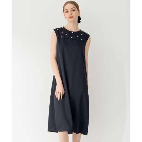 上品なサテン素材で仕立てたノースリーブサテンドレス。品よく胸元にあしらわれたビジューが顔回りを華やかに演出します。裾に向かって広がりすぎないナローなラインになるように仕上げたこだわりのシルエットです。