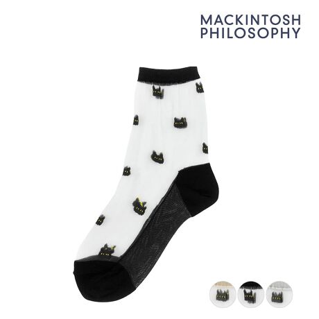 英国を代表するブランドMACKINTOSH PHILOSOPHY(マッキントッシュ・フィロソフィー)のクルー丈ソックスです。シースルーでフェミニンな雰囲気に、目を光らせるネコが散りばめられたかわいい一足です。