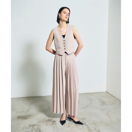 落ち感のきれいなトリアセ素材を使用した、カラーレスのショート丈ジレ。スリーブレス&短め丈のミニマルなシルエットが、トレンド感溢れるデザインです。バックスタイルはサテン素材を使用した、本格的なメンズのベストのようなディテールにこだわったデザイン。すっきり華奢見えするコンパクトなフォルムで、トレンドのワイドパンツと相性良く合わせていただける一枚に仕上げました。お揃いでお作りしたジャケットやパンツと合わせた綺麗めセットアップスタイルにはもちろん、お手持ちのスカートやワンピースにレイヤードすればマニッシュなスタイリングを楽しめます。